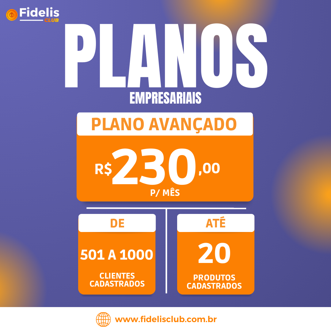 ➡️ Fidelize seus clientes de forma inteligente! Com o Plano Avançado do Fidelis Club, você cadastra de 501 a 1.000 clientes e oferece recompensas.